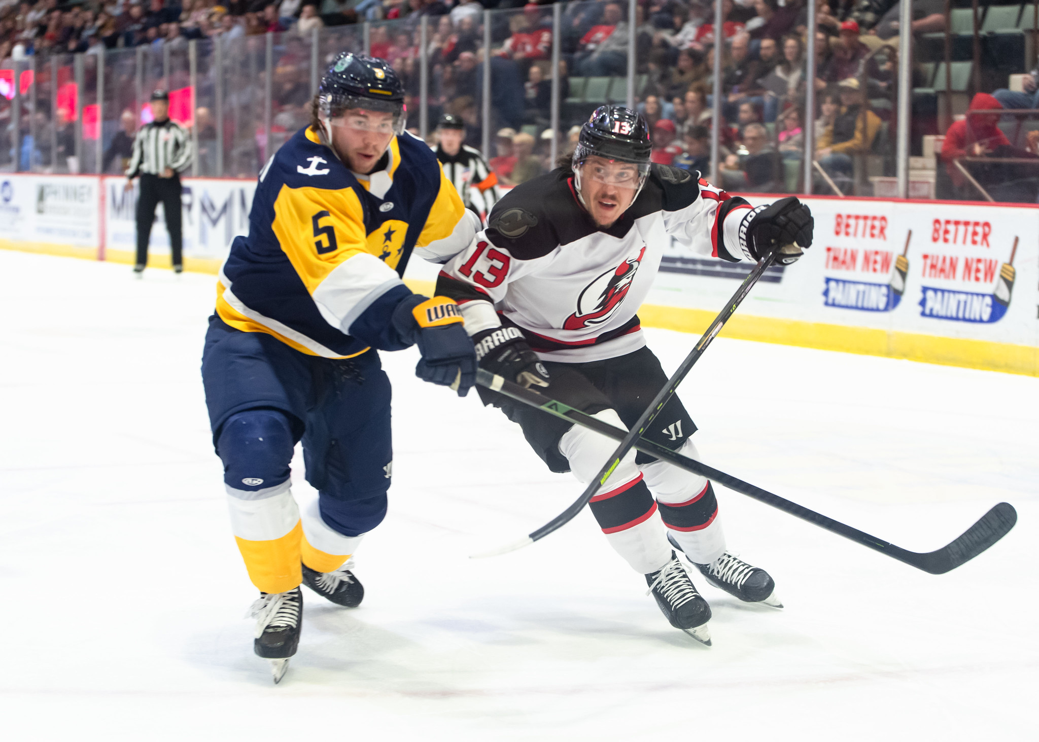 Adirondack Thunder forward Tyson Fawcett (right) vs. the Norfolk Admirals